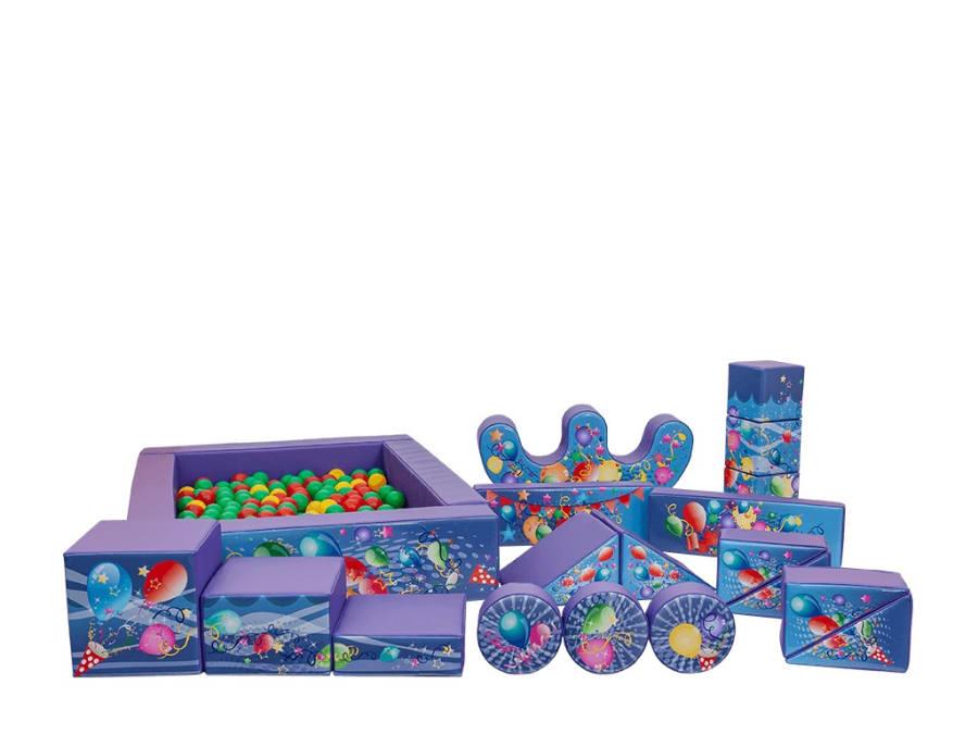 - Includes cushioned blocks, ramps, climbable shapes and a spacious ball pit.